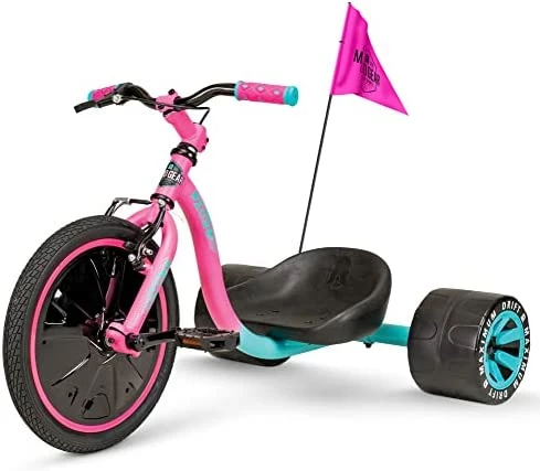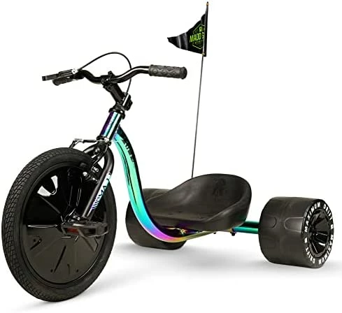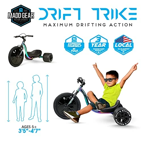 - 3๏ธ WHEELED FUN – The Madd Gear Drift Trike is complete with a 16โ Front Wheel with Durable Treaded Tire and Integrated Spoke Covers and two Super-Hard compound Blow molded Fat Tread Rear wheels (Replacements available for purchase). It is the most fun you can have on three wheels! You’ll be sliding, drifting and even doing full 360’s with ease! Designed for riders 5 years and up