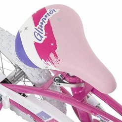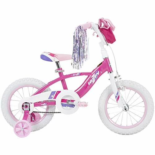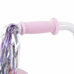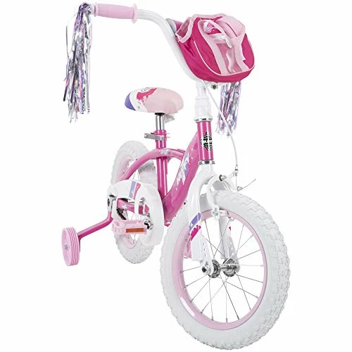- Style: The bright pink frame is accented by white tires and handlebars; plus, a fun handlebar bag and shimmering streamers are included