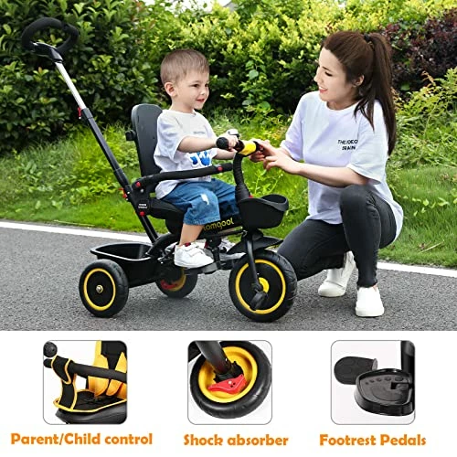 - ?TWO WAYS TO RIDE? The smart trike bike for toddlers offers two ways to ride. Flip down the footrest to allow your kids to rest their feet on it while you steer and push the trike. Fold up the footrest to avoid hitting their legs and feet while they start pedaling. The tricycle with parent steering push handle which is height adjustable for easy control and can be removable when the child ride on their own.