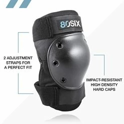 - High-density, impact-resistant caps are securely anchored with reinforced rivets for maximum protection; Wrist guards, elbow pads, and knee pads have top and bottom adjustable straps for a secure fit