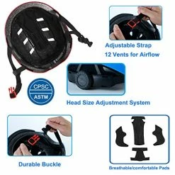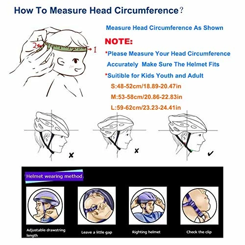 - ADJUSTABLE FIT – Side Release Buckles Adjust and Fasten Quickly, for Head Size: S:48-52cm/18.89-20.47in M:53-58cm/20.86-22.83in L:59-62cm/23.23-24.41in. This kids bike helmet is easily adjustable for a snug fit, it could grow with your child for a few years. Sizes also meet for adults women man